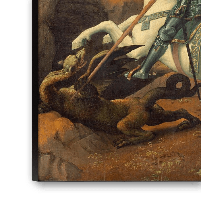 Saint George and the Dragon, one of two versions of the theme by the artist, belonged to a series of miniature panels that Raphael painted in Florence for the celebrated court of Urbino. A Roman soldier of Christian faith, Saint George saved the daughter of a pagan king by subduing a dragon with his lance; the princess then led the dragon to the city, where the saint killed it with his sword, prompting the king and his subjects to convert to Christianity.