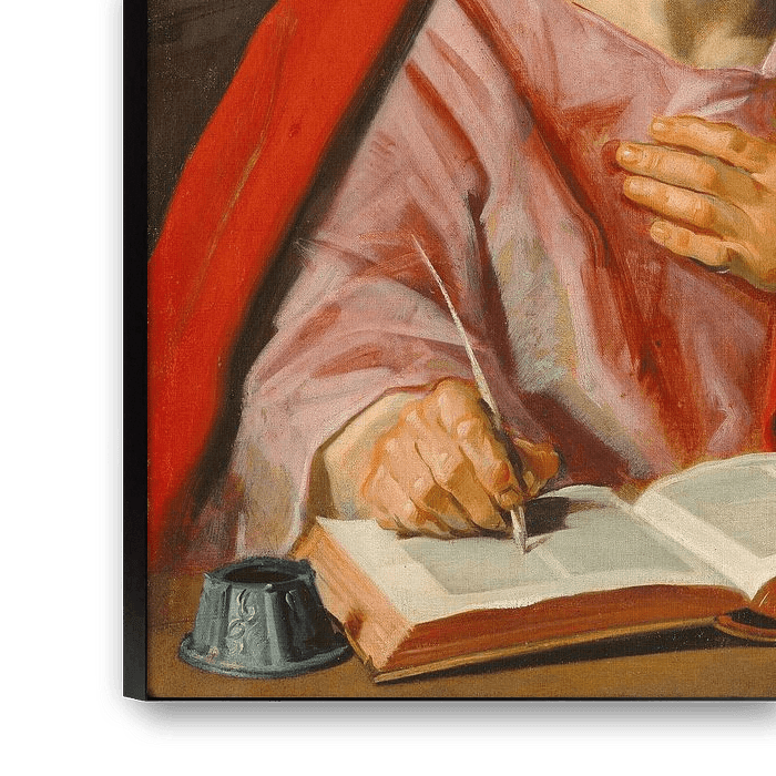 Observed by his symbol, the eagle, and poised to write God's words, Saint John looks up for divine inspiration, which he receives as brilliant light. Saint John, the Galilean fisherman who became one of Christ's apostles, is traditionally considered the author of the Gospel according to John and of the Bible's Book of Revelation. Hals used only light and handling of paint to create the lifelike, fleeting quality that made his portraits so prized. He chose a dramatic moment, then captured it with bold, spontaneous brushwork. A contemporary reported that Hals called the final touches he made to his canvases "putting in his handwriting"--adding the trademark highlights that give his pictures much of their sparkle.