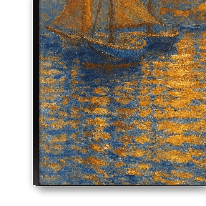 This radiant Monet-inspired artwork showcases Saint-Tropez Harbor at sunset, bursting with golden light and vivid color. The warm Mediterranean sun hangs low on the horizon, casting shimmering reflections across the water. The sailboats glow in rich tones of orange and deep blue, their masts rising gracefully against the sunlit façades of the harbor town. Soft impressionist brushwork captures the movement of light as it ripples across the sea, creating a vibrant and emotionally charged seascape.