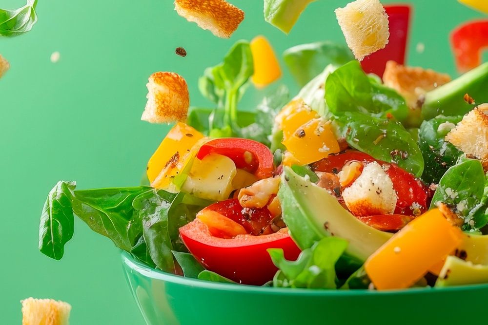 Fresh colours dance in the air and come together to create a vibrant vegetable feast. Crispy cubes of bread and crunchy leafy greens mingle with brightly coloured peppers, while the exciting dynamism of this scene radiates energy and vitality. This work of art fits perfectly into any kitchen and creates an inviting, healthy highlight for any room.