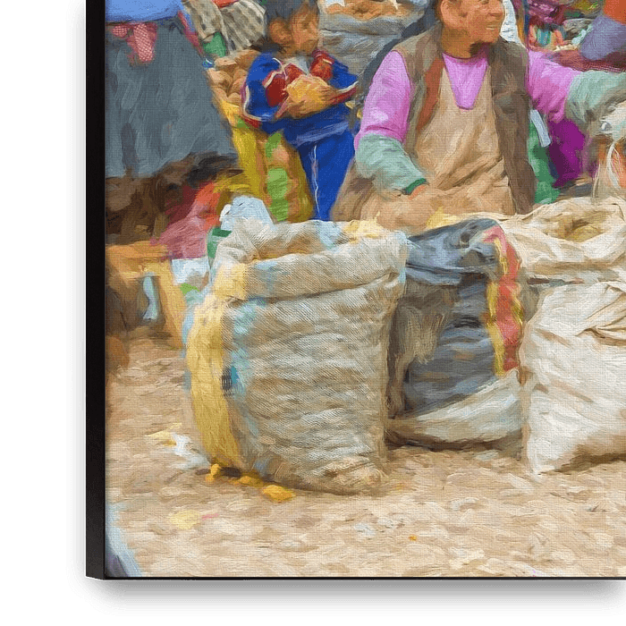 Women sell their food, vegetables and potatoes at the market in the Peruvian Andes. Pisac is known for its market, which attracts many tourists from nearby Cusco. This oil painting on canvas produces a beautiful impressionistic print.