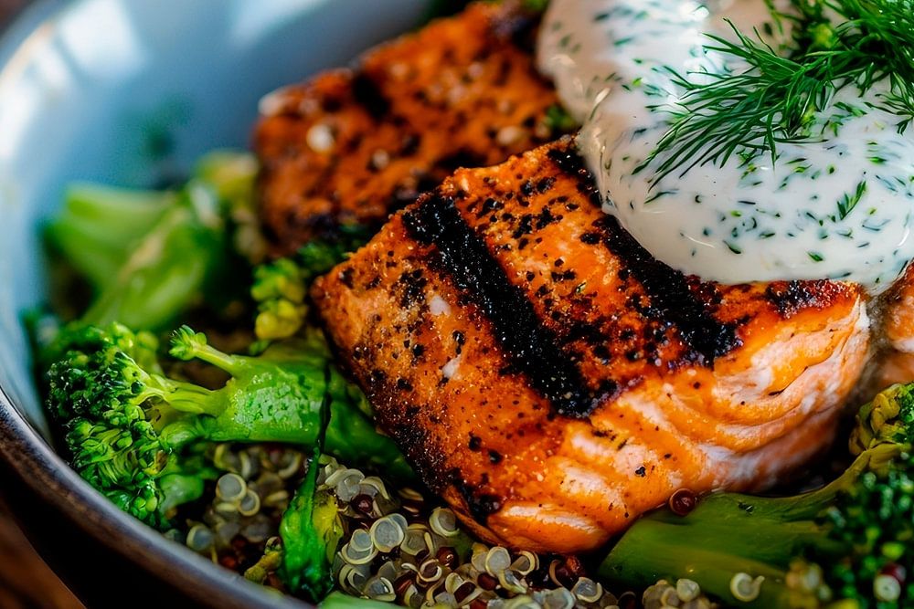 A culinary masterpiece that whets the appetite! Succulent salmon, harmoniously accompanied by fresh broccoli and quinoa, topped with a fine dill cream. The warm, inviting colours and careful presentation make it ideal for the kitchen. Here, every meal becomes an experience that invites you to savour and linger.