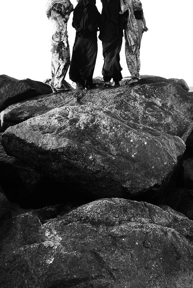 Vier moslima vrouwen op de rotsen kijken uit op zee, je ziet ze turen, verstilt, verzonken in gedachten. Waar ze aan denken blijft in het ongewisse.. of.. in je eigen verbeelding.