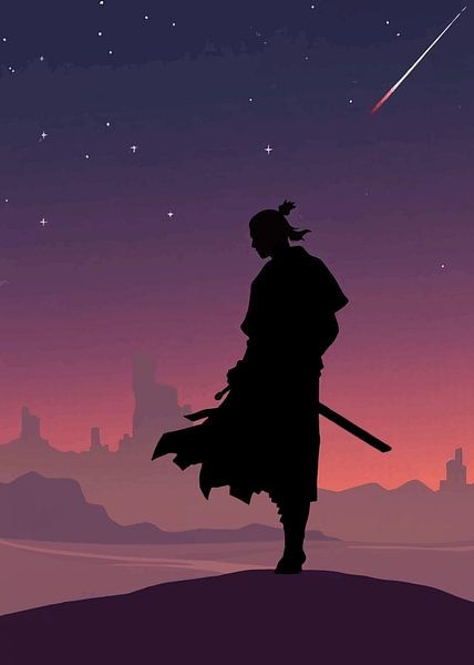 A lone samurai silhouette stands with a katana against a vast desert horizon beneath a star-filled evening sky. A distant comet streaks across the heavens, creating a sense of destiny and quiet power. The minimal silhouette composition emphasizes strength, discipline, and timeless warrior spirit while allowing the landscape to tell the…