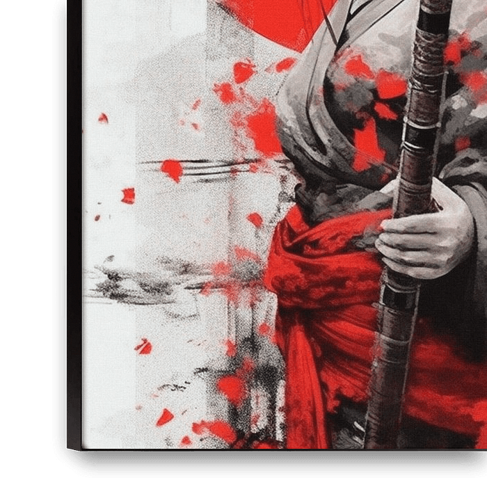 A striking portrait of a female warrior. Standing before a bold red sun, she holds a staff with calm resolve. The art style mixes charcoal sketches with red watercolor splashes, symbolizing a perfect balance of grace and lethal strength.