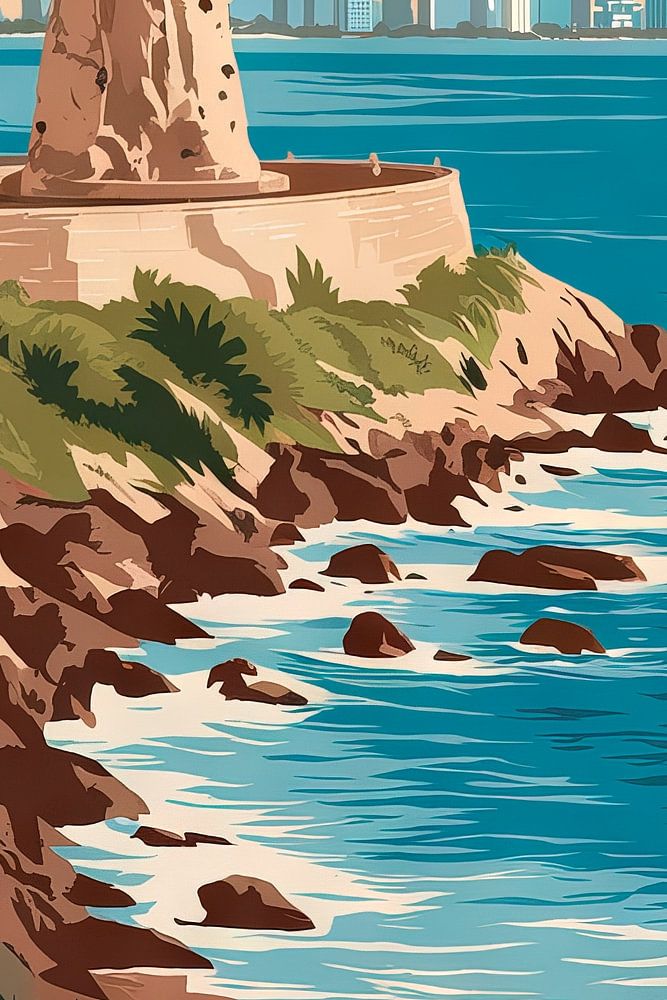 An idyllic coastal panorama that caresses the sunny waves of San Diego draws the eye. Majestic rocks and gently swaying palm trees create a holiday atmosphere. The harmonious colour palette in soft earth tones and vibrant shades of blue and green makes this work of art perfect for a living room, where it radiates cosiness and wanderlust at the same time.
