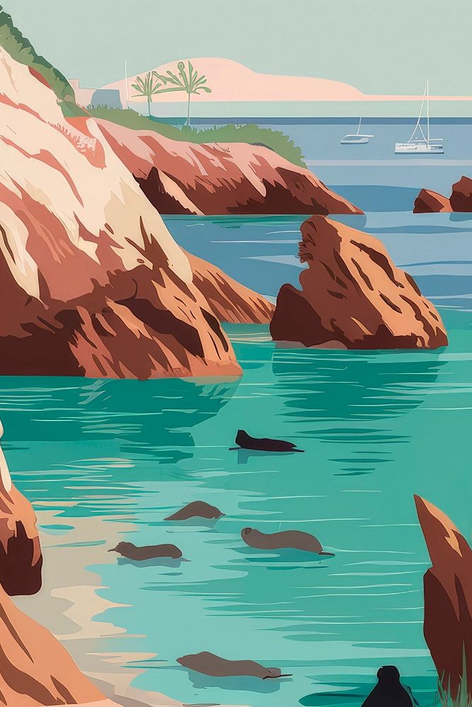 A harmonious coastal landscape unfolds, with the redeveloped coastal town of San Diego glowing in soft pastel colours. The gentle waves play around the rocks, while the sky is adorned with delicate clouds. Perfect for the living room, this picture invites you to dream and relax and brings a piece of holiday into your home.