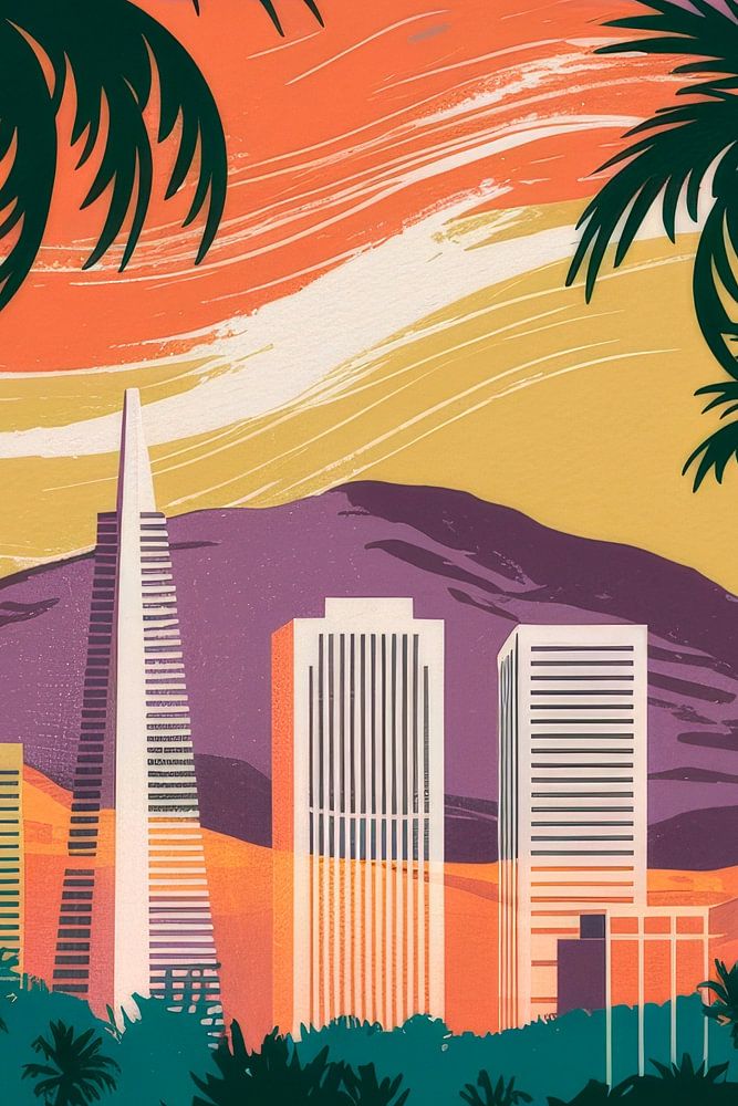 A vibrant piece of California: palm trees sway gently against a breathtaking skyline and the rolling hills in the background. The warm colours of the sunset lend the motif an inviting energy. Perfect for the living room, this artwork brings a touch of adventure and joie de vivre to any room.