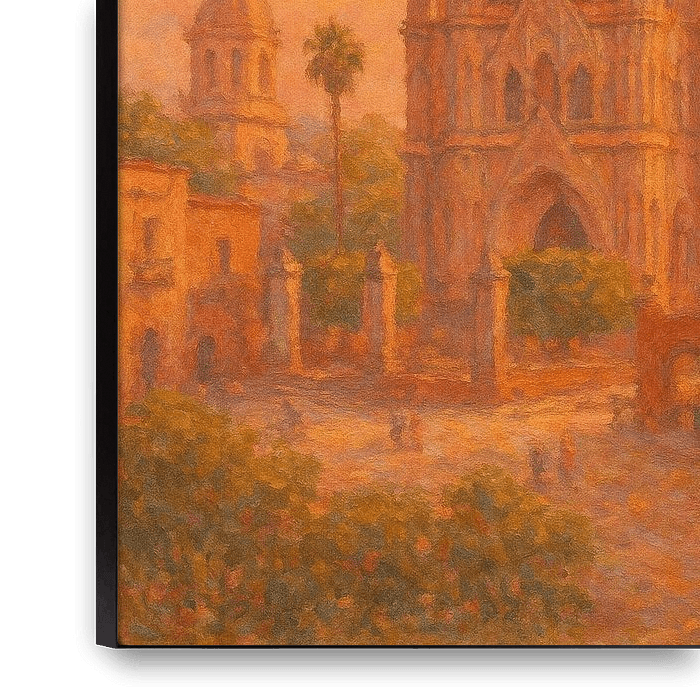 When the sun descends upon San Miguel de Allende, it does so like a benediction. The iconic cathedral glows as if lit from within — a rose-colored flame against a sky of molten gold. The artist channels the emotional luminosity of Claude Monet’s cathedral series, but reinterprets it through Mexico’s warm light and spiritual…