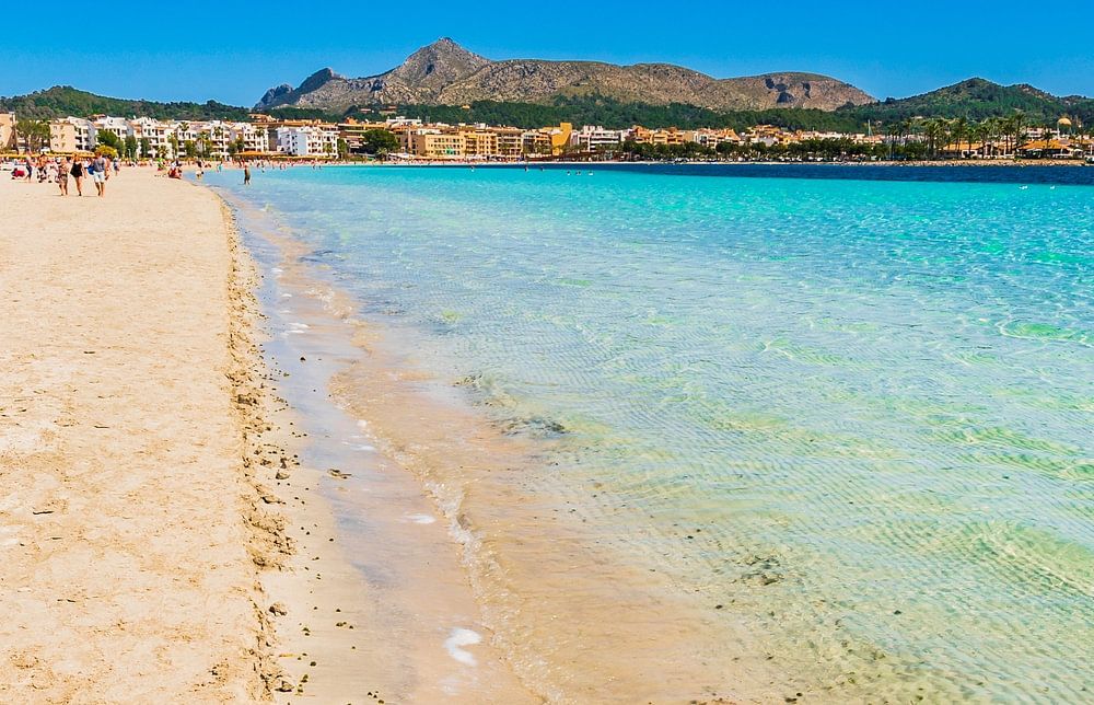 Sand beach at bay of Alcudia with clear turquoise sea water, Mallorca Spain, Balearic islands, Mallorca, Balearic Islands, Balearic Sea, Mediterranean Sea, Spain