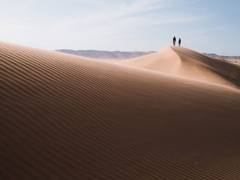 Two hikers walk along the crest of a tall sand dune in the vast desert of Wadi Rum in Jordan. From a low vantage point, the fine lines in the sand are clearly visible, formed by the wind that constantly reshapes the landscape here. These natural patterns gently guide the eye upwards towards the dune’s crest, where the two figures appear…