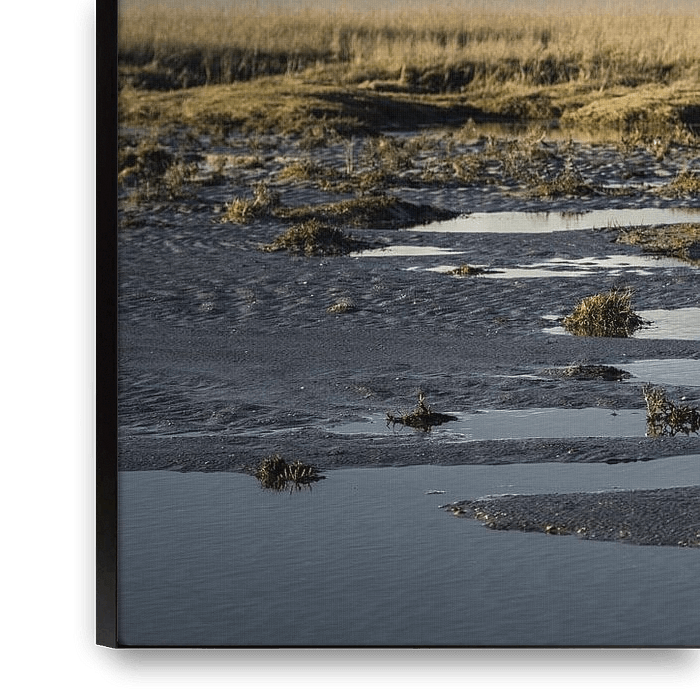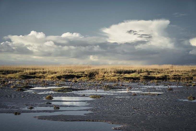 The landscape photograph "Sankt Peter-Ording III" shows puddles in the Wadden Sea at low tide. A band of clouds stretches across the salt marsh on the horizon. Taken on a sunny day in the winter of 2025.