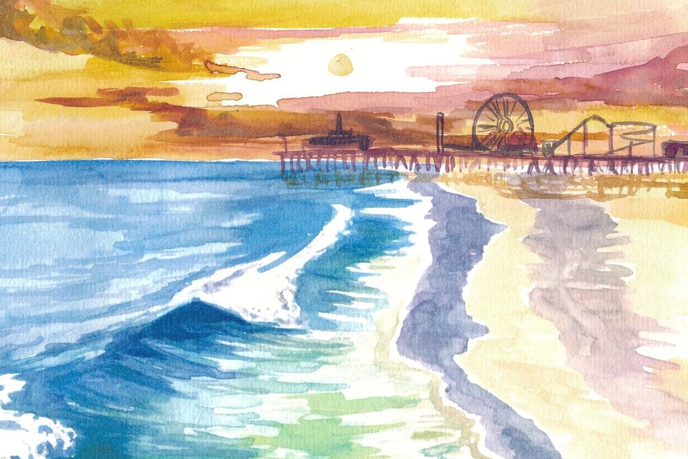 Buy this painting Santa Monica Pier in the golden Californian sun by Markus Bleichner as a reproduction on canvas, ArtFrame, poster and wallpaper, printed on demand in high quality.