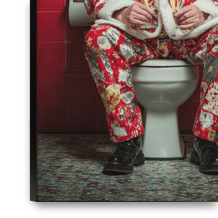 A deadpan, fashion-forward Santa sits on a toilet in a glossy red-tile bathroom, dressed in a loud holiday suit with plush white trim. He holds two sparkling champagne flutes like a formal toast, while the mosaic floor and retro vibe keep it cheeky and collectible.