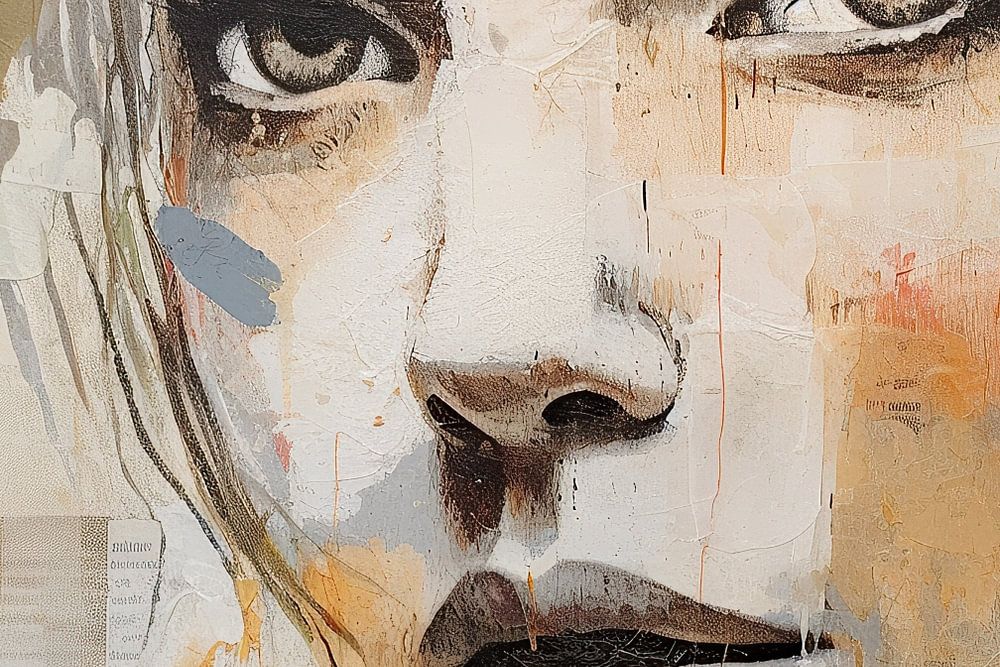 Sarah Portrait - abstract painting / mixed media art painted. Nice contrast between sophisticated portrait and raw collage/painting technique.