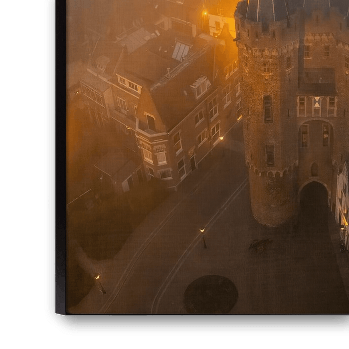 View on the Sassenpoort in the city of Zwolle, Overijssel, The Netherlands during a cold winter day with a hazy fog over the city seen from above.