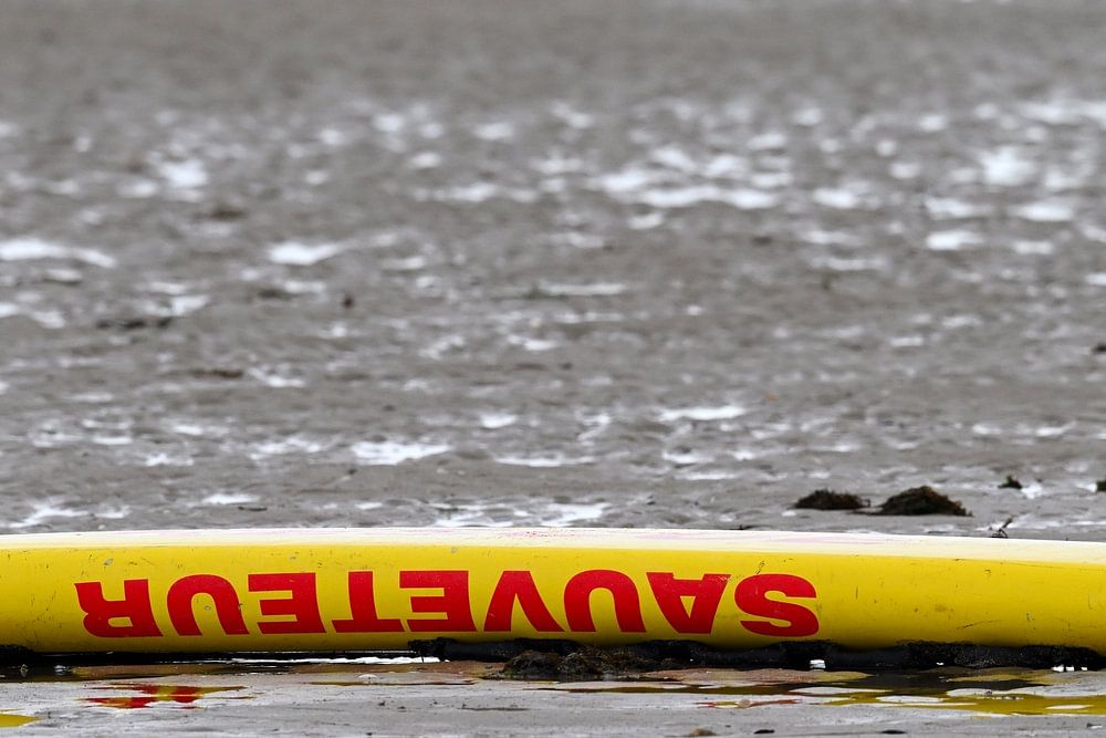 Lifeguard surfboard on Normandy beach. The rescuer is nowhere to be seen.