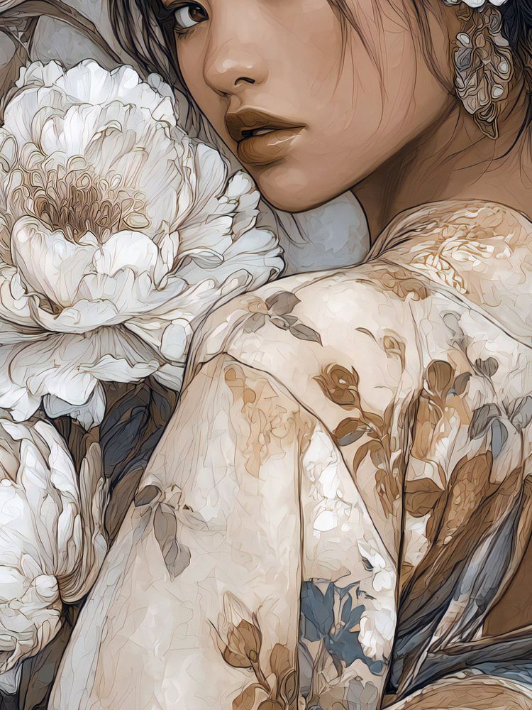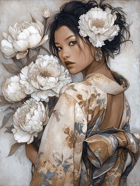 Illustration of a girl in a kimono with peonies