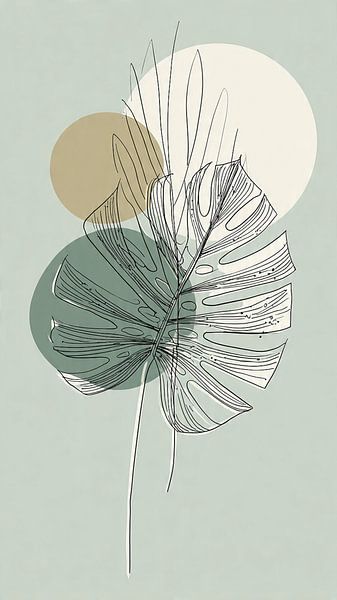 This artwork features an elegant and minimalist illustration of a monstera leaf, also known as the Swiss cheese plant. The leaf is rendered with delicate black lines, clearly showing its characteristic notches and openings. The background consists of soft, overlapping shapes in calm colours such as light green, grey-green, beige and a…