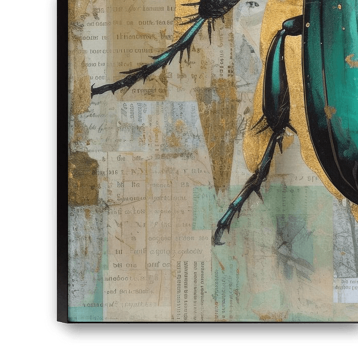 The scarab faces a background composed of a layered mix of cutouts, splashes and smudges that add a sense of movement and spontaneity to the artwork. They suggest a certain degree of chaos and energy, providing an interesting contrast to the textured and shiny shields of this symbolic insect, which has played an important role in the history and culture of several ancient civilisations.