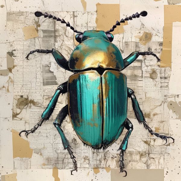 The scarab faces a background composed of a layered mix of cutouts, splashes and smudges that add a sense of movement and spontaneity to the artwork. They suggest a certain degree of chaos and energy, providing an interesting contrast to the textured and shiny shields of this symbolic insect, which has played an important role in the history and culture of several ancient civilisations.