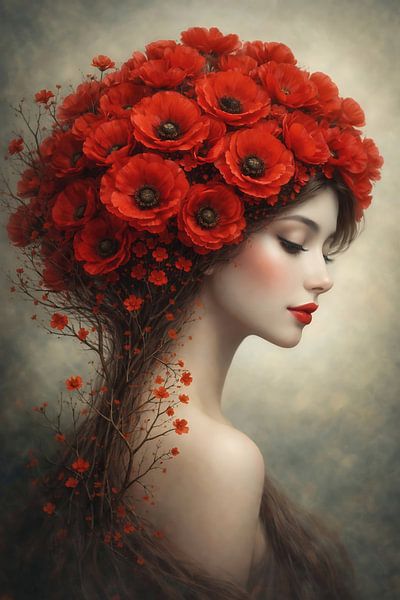 This portrait forms a serene bridge between the human soul and the unbridled power of nature. At its centre is a woman in a state of deep relaxation, enveloped in a lush crown of blooming red poppies. The flowers, symbolising both tranquillity and remembrance, seem to spring organically from her thoughts. What makes this work so special…