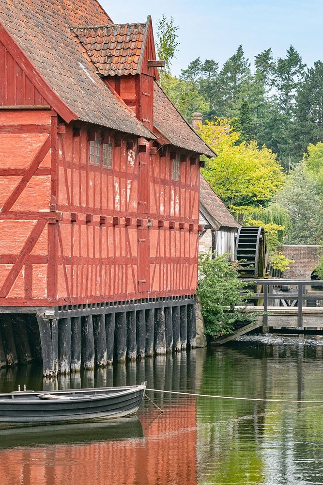 Charming red timber house by a peaceful canal, reflecting traditional Danish architecture. Surrounded by lush greenery and tranquil waters, this serene scene with watermill in the background