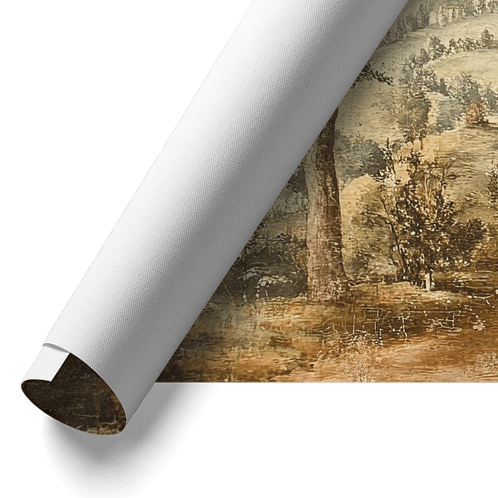 This fresco-style mural depicts a beautiful Tuscan landscape with a rustic stone house and a winding path leading into the hills. Tall cypress trees and a majestic tree adorn the scene, while rolling green hills and distant cottages enhance the depth of the landscape. The weathered texture of the painting gives it a nostalgic and timeless look, typical of classic Italian art.