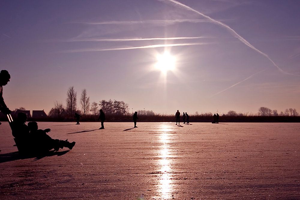 Schaatsen op het platteland van Nederland bij zonsondergang