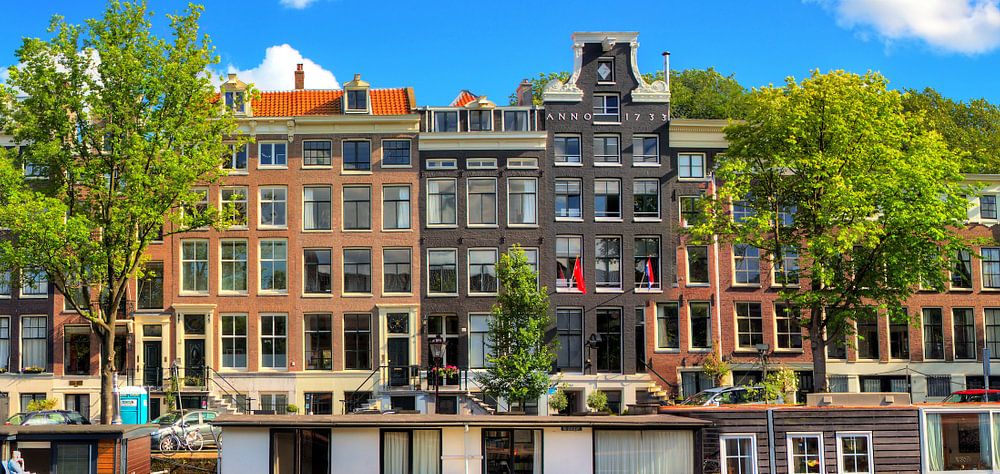 Prachtige lineaire panoramische opname van de Schaduwgracht in Amsterdam op een mooie zomerdag met wolken