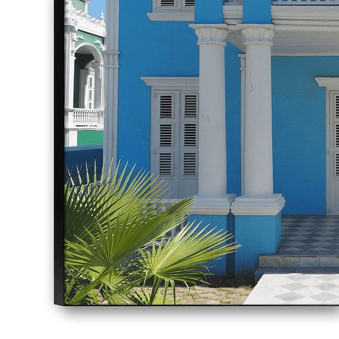 The striking blue building stands next to the National Archives Curaçao in Sharloo and is rented and used by that organization as administrative office.