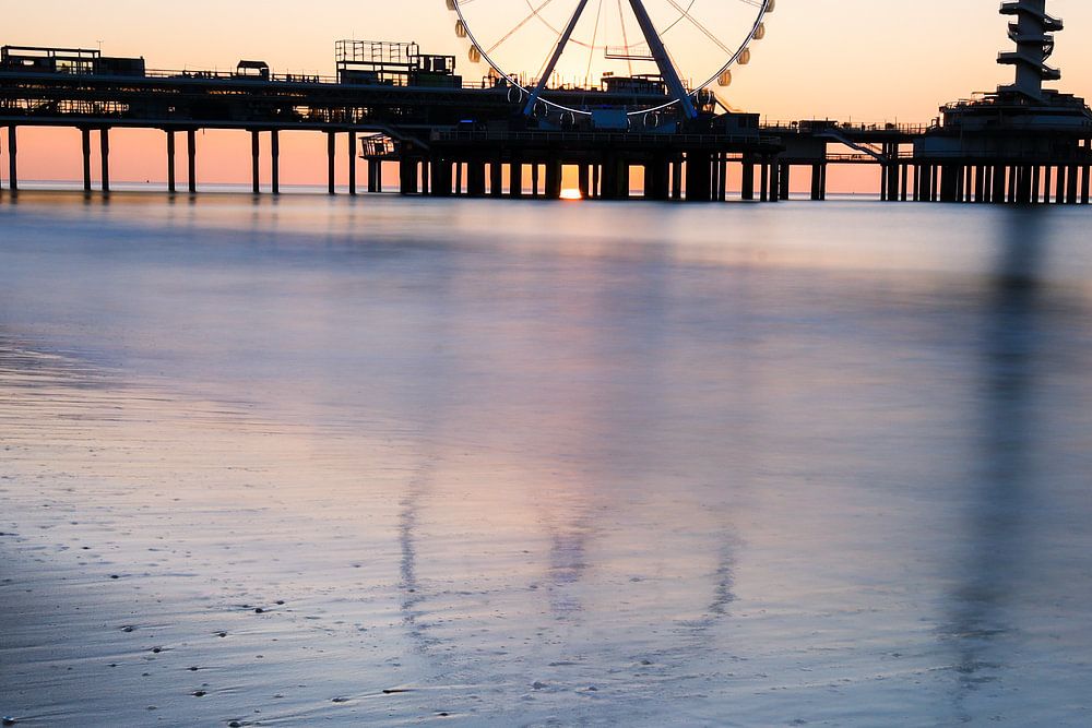 The pier consists of a fully covered promenade with an open walking deck above it and three (until 2016 four) islands at the far end. On the back island on the right (the tower island) is a lookout tower with a 45-meter-high viewing platform that - in ideal weather conditions - offers views of up to 17 kilometers. At its base is a pancake restaurant and on the tower is a bungee jumping installation. The building on the front island on the left (called Solar Island or South Island) houses a restaurant (Pier Zuid). The steel island added to the pier afterwards was furthest out to sea and was the only one not directly connected to the promenade, but to the solar island. Until its closure in February 1991, it housed an attraction. For a number of years, the fireworks for the Scheveningen Fireworks Festival were also set off here. These fireworks are now fired from a floating pontoon at sea. The front island on the right (called pirate island or treasure island) housed an amusement arcade aimed at children. The structure on this island was removed in 2015 in anticipation of the construction of a Ferris wheel. This Ferris wheel named Skyview The Pier was officially inaugurated in 2016.