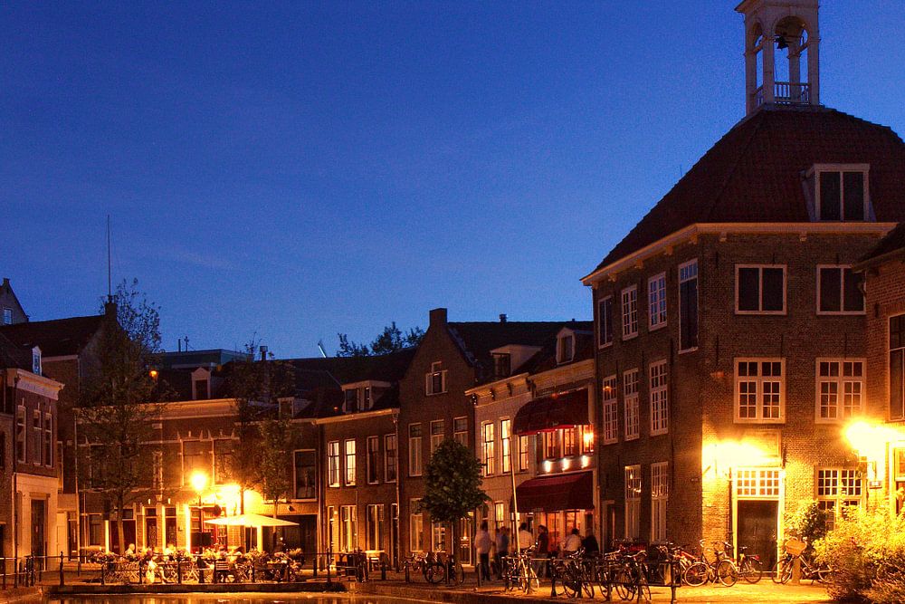 De Schie in Schiedam nabij de Oude Sluis. Dit gedeelte van Schiedam, de Brandersbuurt, ligt nabij de dam waar Schiedam zijn naam aan te danken heeft. Deze avondopname met lange sluitertijd werd drie kwartier na zonsondergang gemaakt. Het gebouw met het torentje op het dak is het Zakkendragershuis.