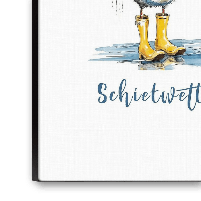 The illustration shows a stylised seagull hovering amidst a white background. The seagull is depicted vividly and in detail with a blue and white striped plumage, which gives it a fresh and maritime feel. Below her is a puddle in which she stands wearing bright yellow wellies. The rubber boots are so big that they almost fill the entire puddle and the water splashes up around the boots. A few drops fall from the boots onto the ground as the seagull looks at the water.