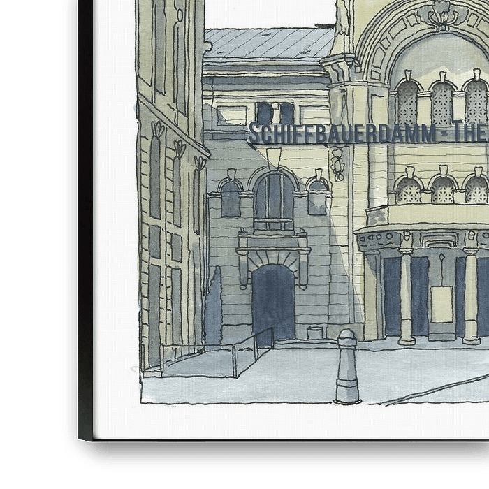 Buy this illustration Schiffbauerdamm Theatre in the Berlin of the 20s by Sandra Brill on canvas, ArtFrame, poster and wallpaper, printed on demand in high quality.