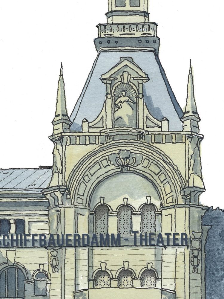 The hand-drawn illustration in ink and watercolours shows the Schiffbauerdamm Theatre in 1920s Berlin. Today the spire is missing.