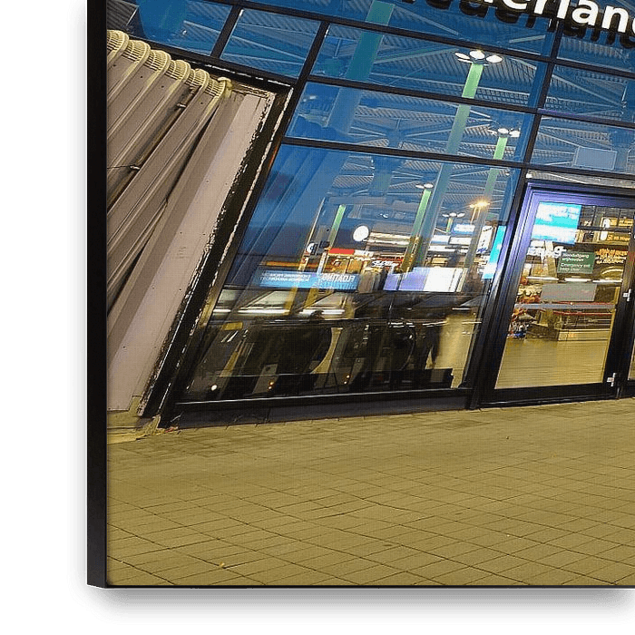 The entrance to Schiphol airport and train station at dusk. The photo was taken on 31 August 2012.