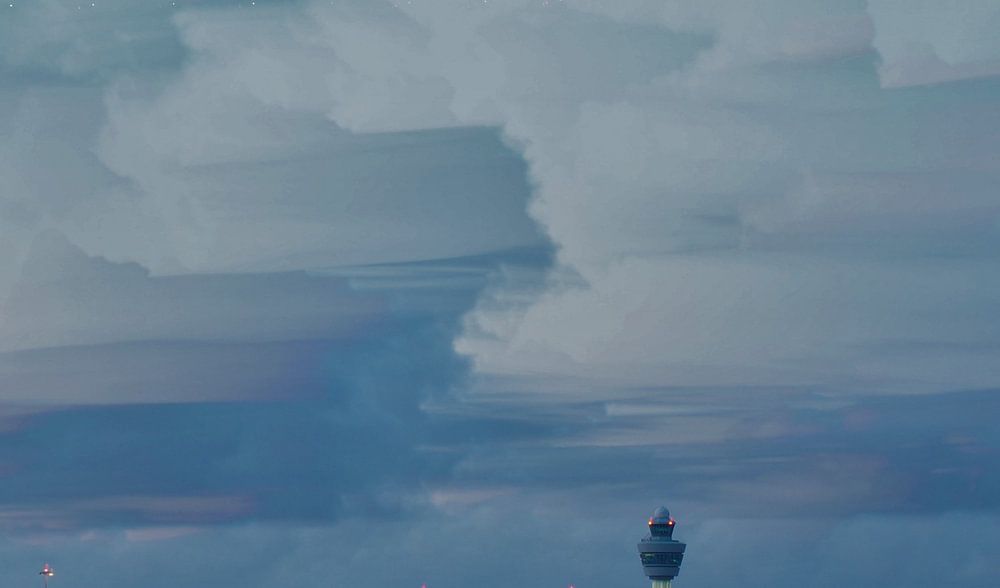 Schiphol from a distance as the sun is just setting. The stripes at the top and bottom right are from planes taking off