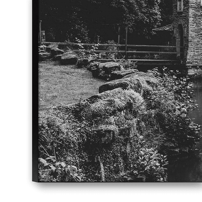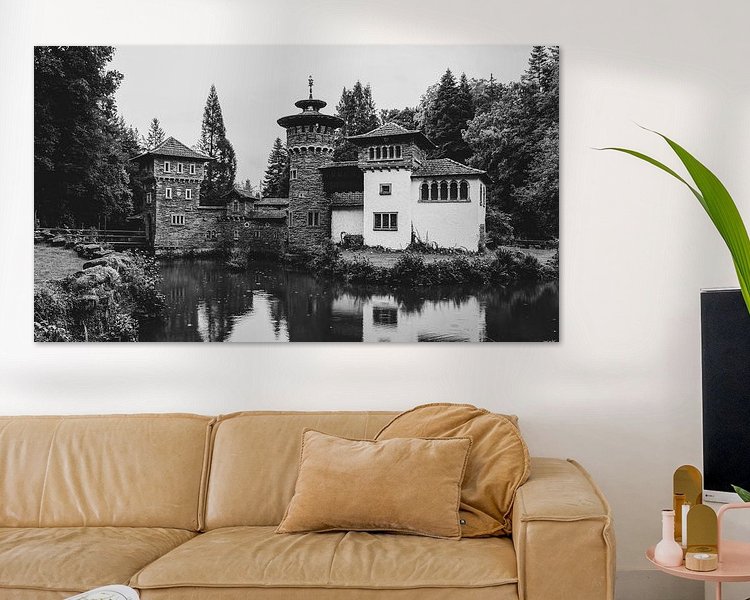 The unique architecture of 20th century Schloss Turelbaach amidst the scenic landscape of Mertzig, in Luxembourg. The castle here captured in black and white, is a blend of 20th-century medieval and modern architectural styles. Situated on a serene lake, amidst forest and in a quiet valley, the castle recently bought by the municpality, is now accessible to the public.