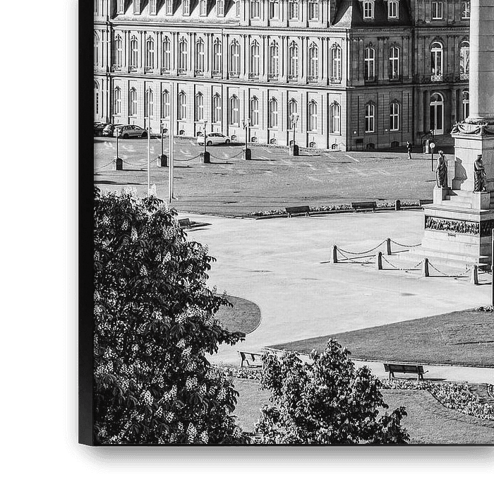 Buy this landscape artwork Schlossplatz in Stuttgart - black and white by Werner Dieterich on canvas, ArtFrame, poster and wallpaper, printed on demand in high quality.