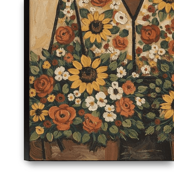 Three women shine amidst lush bouquets of sunflowers and roses, wearing beautiful wide-brimmed hats adorned with fresh flowers. Their floral-print blouses blend seamlessly with the colourful market setting. This African figurative painting, rendered in warm earth tones, celebrates the connection between women and nature. The impasto…