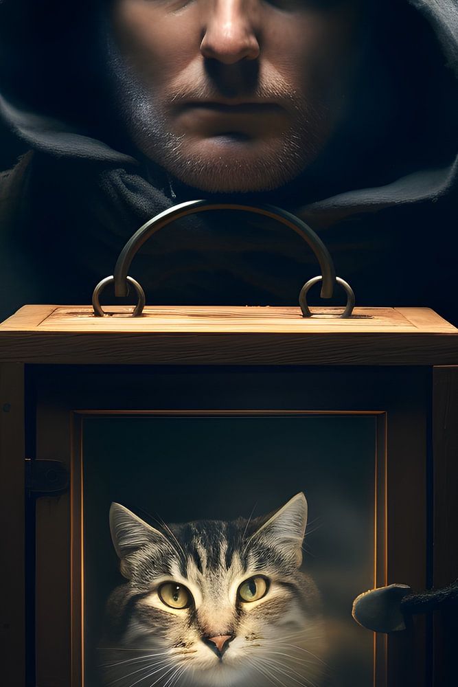 We present "Schrödinger's Cat", an exquisite work of art that captures a thought-provoking moment: a man in a hoodie holds a wooden lantern with a mysterious cat against a dark background. The symmetrical composition and portrait photography convey a sense of balance and intrigue that is enhanced by the chiaroscuro lighting, which emphasises both the man's detailed features and the cat's intricate fur. This high-resolution, super-realistic image invites the viewer to reflect on the duality of existence, combining artistic mastery with philosophical depth in a striking visual narrative.