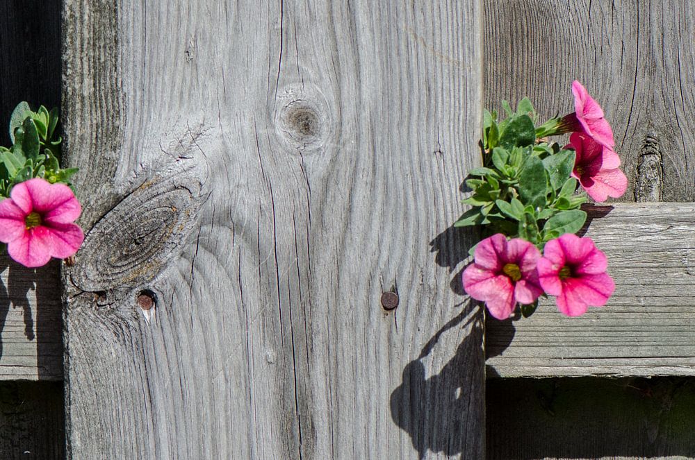 Afscheiding van een tuin, waar ik regelmatig tegen aankijk als ik de auto uit de garage haal. Nu kwamen er ineens roze petunia's tussendoor schieten. Hoe vrolijk kan het zijn ... een simpel roze bloempje.
