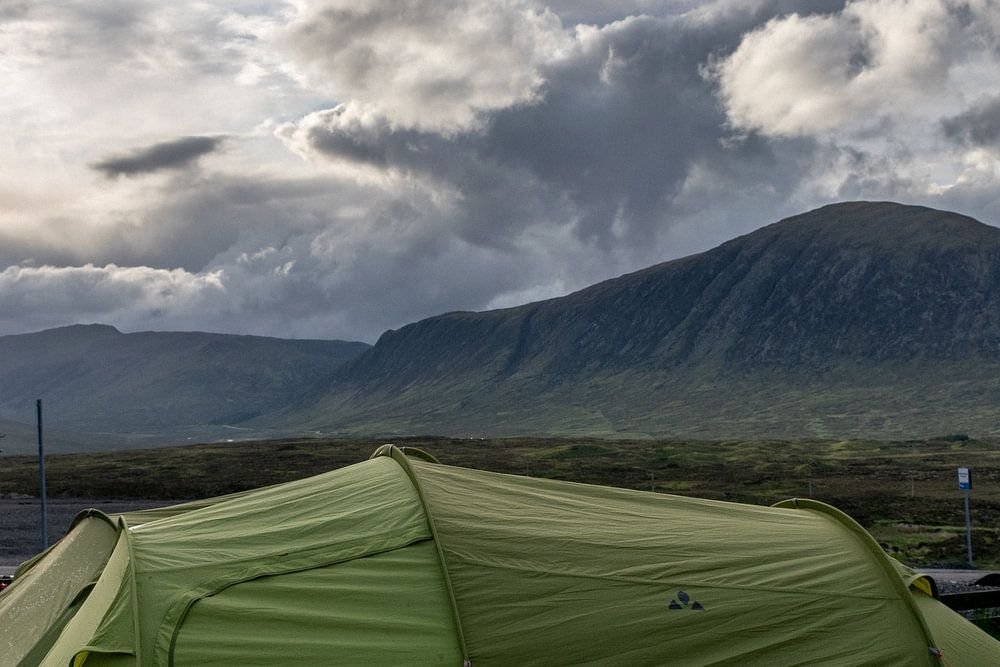 Tent set up at the foot of Mount Stob Dearg in the Glen Coe area of the Scottish Highlands.