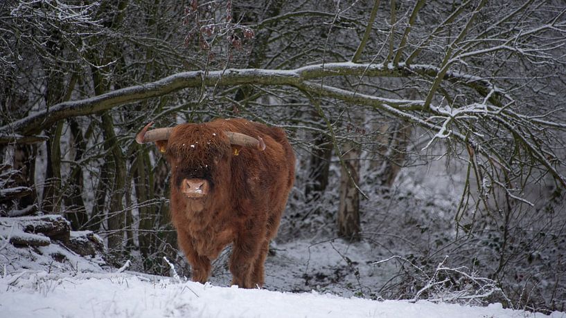 A Scottish highlander, a large, sturdy bull, stands in a snowy landscape. It has just snowed, and there are still snowflakes on his head and body. He is a calm, quiet animal with a thick coat of long hair. He is not cold; in fact, they find this temperature ideal. With its thick, large horns and thick head, which is typical of bulls, it…