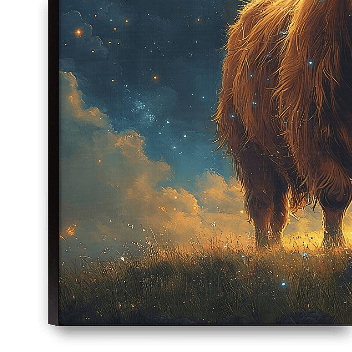 A highland cow standing in a field, with a background of stars and planets in a fantasy style. This illustration would be suitable for a book cover, with a hyper-realistic and cinematic look.