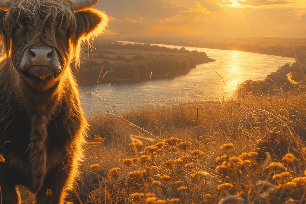 With a warm sunset in the background and a Scottish Highland cattle as the proud centrepiece, this idyllic nature painting captures the essence of rural beauty. The scene is set in a sea of heather, whose purple hues lend the painting a calming depth. The artist's detailed brushwork emphasises the soft fur of the cattle and gives the composition an almost tangible texture. This artwork epitomises the untouched elegance of the Scottish wilderness and is the perfect piece for anyone longing for a touch of nature in their living space.