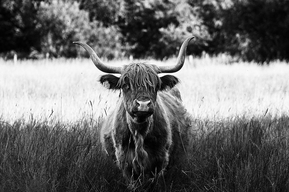 In the middle of the tall grass, surrounded by gently rustling trees and under a sky of muted black and white, it stands like an apparition from another time: a Scottish Highland cow, powerful and peaceful at the same time. The long, curved horns rise into the sky like symbols of originality, the thick, shaggy coat looks like a cloak of nature itself. His gaze, directly into the camera, is calm - not demanding, but knowing. Almost as if it were saying: "I am part of something bigger."