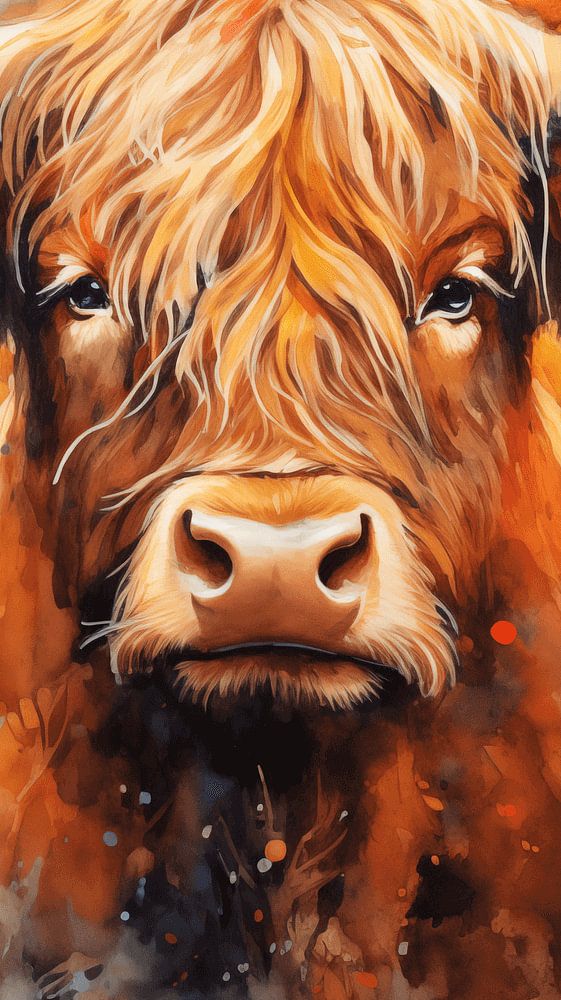 Buy this landscape artwork Scottish Highland cow with horns, oil painting, vertical drawing by Animaflora PicsStock on canvas, ArtFrame, poster and wallpaper, printed on demand in high quality.