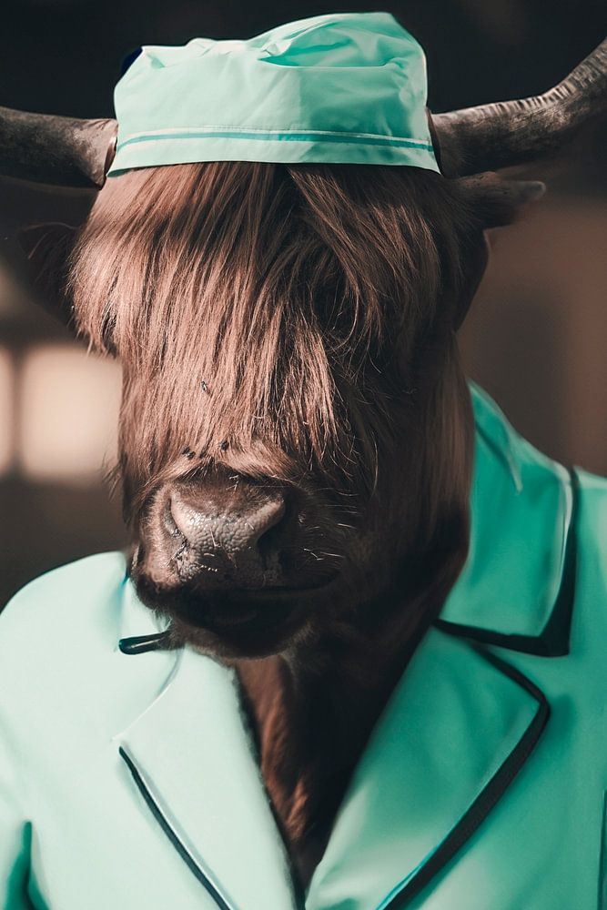 In a grim Victorian hospital, where the walls bear witness to years of medical deprivation, a remarkable figure takes centre stage: a Scottish highlander, dressed in the traditional doctor's attire of the era. His imposing stature is enveloped by a doctor's coat, and a doctor's hat rests proudly on his head. His impressive horns stand out against the sombre background of antique medical instruments and dark wooden panels.